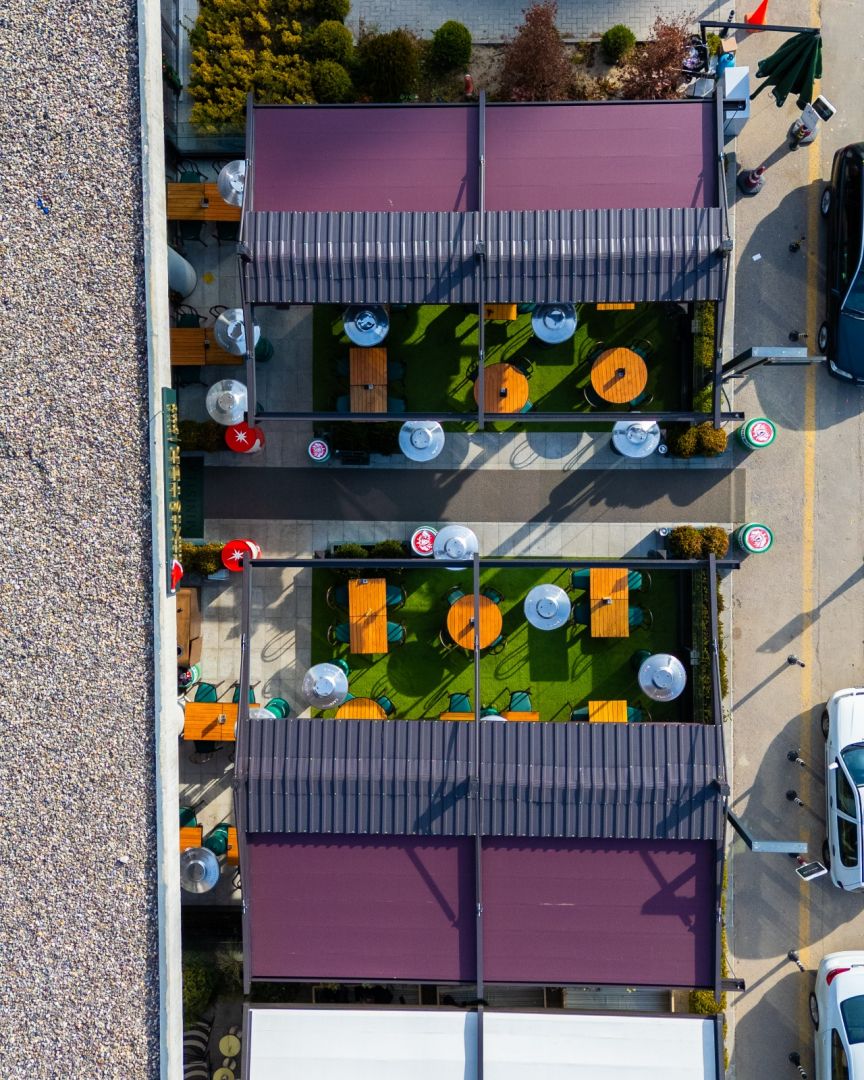 Özel alüminyum pergola kesitli taşıyıcı konstrüksiyonu ve ithal blackout kumaşı ile tüm iklim şartlarına dayanıklı üründür. Uzaktan kumandalı motoru ile kumaş raylarda katlanarak açılıp kapanır.